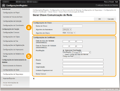 Não é possível selecionar [512 bits] para o comprimento da chave se tiver selecionado [SHA384] ou [SHA512] para [Algoritmo de Assinatura].