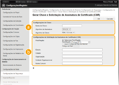 É possível criar um par de chaves com a máquina quando tal for necessário para comunicação codificada através de TLS (Transport Layer Security). Pode utilizar o protocolo TLS quando pretender aceder à máquina através da UI Remota. É possível criar até cinco pares de chaves (incluindo os pares pré-instalados) para a máquina. São utilizados certificados autoassinados com pares de chaves criados em "Comunicação de Rede". Com "Chave e Solicitação de Assinatura de Certificado (CSR)", pode pedir um certificado digital emitido por uma AC para o par de chaves criado pela máquina.