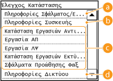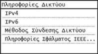 Εμφανίζει τις ρυθμίσεις δικτύου, όπως η διεύθυνση IP του μηχανήματος και η κατάσταση, όπως η κατάσταση επικοινωνίας ασύρματου LAN.