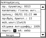 Εμφανίζει την τρέχουσα κατάσταση του επιλεγμένου στοιχείου. Παρακάτω απεικονίζεται η οθόνη <Κατάσταση Εργασιών Αντιγραφής> ως παράδειγμα.