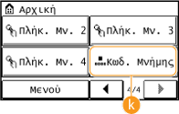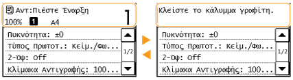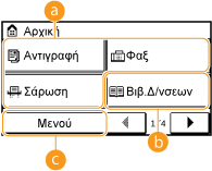 Στην οθόνη εμφανίζονται η <Αρχική> οθόνη από την οποία μπορείτε να εκκινήσετε διάφορες λειτουργίες και να ανοίξετε άλλες οθόνες για τον καθορισμό ρυθμίσεων. Επίσης, μπορείτε να δείτε την εξέλιξη των εργασιών και μηνύματα. Πατήστε στην οθόνη για να κάνετε τις επιλογές που θέλετε.