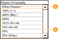 Μπορείτε να μεγεθύνετε ή να σμικρύνετε τα αντίγραφα χρησιμοποιώντας μια ειδική κλίμακα αντιγραφής, όπως η <A5->A4>, ή ρυθμίζοντας μια ειδική κλίμακα αντιγραφής σε βήματα του 1%.
