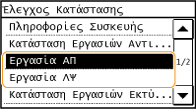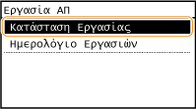 ![]() <Κατάσταση Εργασιών ΑΠ>/<Κατάστ. Εργασ. ΛΨ Φαξ>Εμφανίζει μια λίστα των εγγράφων που αποστέλλονται και λαμβάνονται ή βρίσκονται σε αναμονή για επεξεργασία.