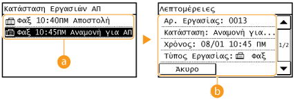 <Λεπτομέρειες>Εμφανίζει αναλυτικές πληροφορίες σχετικά με το έγγραφο που είναι επιλεγμένο στη λίστα. Αν έχετε καθορίσει πολλούς προορισμούς, ο αριθμός των καθορισμένων προορισμών εμφανίζεται στην οθόνη. Για να δείτε λεπτομέρειες για τους καθορισμένους προορισμούς, πατήστε <Προορισμός>. Εάν βρείτε ένα έγγραφο που δεν είναι απαραίτητο, πατήστε <Άκυρο> ή <Διαγραφή> και πατήστε <Ναι>.