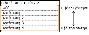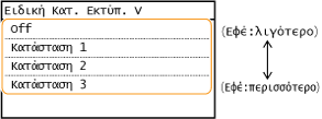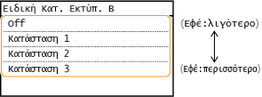 Εάν επιλέξετε <Off> ή <Κατάσταση 1>, μπορεί να εμφανίζονται γραμμές στο εκτυπωμένο χαρτί. Εάν επιλέξετε <Κατάσταση 3> ή <Κατάσταση 4>, μπορεί να είναι θολά τα περιγράμματα ή να είναι ελαφρώς παραμορφωμένες οι εικόνες (κόκκοι). Η πυκνότητα της εκτύπωσης γίνεται ολοένα και πιο χαμηλή όσο προχωράτε από την επιλογή <Off> στην επιλογή <Κατάσταση 4>.