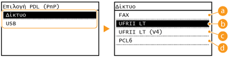 Επιλέξτε γλώσσα περιγραφής σελίδας ώστε η συσκευή να εντοπίζεται ως εκτυπωτής συμβατός με τη συγκεκριμένη γλώσσα όταν είναι συνδεδεμένη με υπολογιστή μέσω της συσκευής Plug and Play. Για περισσότερες πληροφορίες, δείτε την ενότητα «MF Driver Installation Guide (Οδηγός εγκατάστασης προγράµµατος οδήγησης MF)».