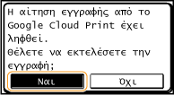 Μπορείτε επίσης να καταχωρίσετε το μηχάνημα από φορητή συσκευή ή μέσω του Google Chrome*. Πριν ολοκληρωθεί η καταχώριση, εμφανίζεται η ακόλουθη οθόνη επιβεβαίωσης στην οθόνη της συσκευής. Πατήστε <Ναι> για να ολοκληρώσετε την καταχώριση.