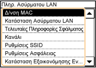 ![]() <Κατάσταση Ασύρματου LAN> και <Τελευταίες Πληροφορίες Σφάλματος> χρησιμοποιώντας το πλήκτρο