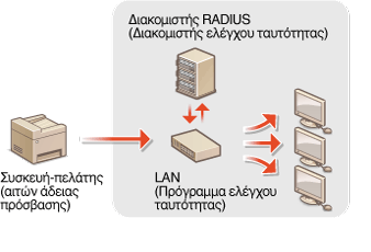 Το μηχάνημα μπορεί να συνδεθεί σε ένα δίκτυο 802.1X ως συσκευή-πελάτης. Ένα τυπικό δίκτυο 802.1X αποτελείται από ένα διακομιστή RADIUS (διακομιστής ελέγχου ταυτότητας), διακόπτη δικτύου (πρόγραμμα ελέγχου ταυτότητας) και συσκευές-πελάτες με λογισμικό ελέγχου ταυτότητας (αιτήσεις άδειας πρόσβασης). Εάν μια συσκευή προσπαθήσει να συνδεθεί στο δίκτυο 802.1X, η συσκευή πρέπει να περάσει από έλεγχο ταυτότητας χρήστη προκειμένου να αποδειχθεί ότι η σύνδεση πραγματοποιήθηκε από εξουσιοδοτημένο χρήστη. Οι πληροφορίες ελέγχου ταυτότητας αποστέλλονται σε και ελέγχονται από ένα διακομιστή RADIUS, ο οποίος επιτρέπει ή απορρίπτει την επικοινωνία με το δίκτυο ανάλογα με τα αποτελέσματα του ελέγχου ταυτότητας. Εάν ο έλεγχος ταυτότητας αποτύχει, ένας διακόπτης LAN (ή σημείο πρόσβασης) αποτρέπει την πρόσβαση από συσκευές εκτός του δικτύου.