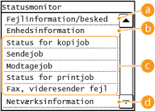 , vises en skærm, der giver dig mulighed for at kontrollere statussen for de dokumenter, der udskrives, sendes eller modtages, samt statussen for maskinen (mængde tilbage i tonerpatronen osv.) og netværksindstillinger som f.eks. maskinens IP-adresse.