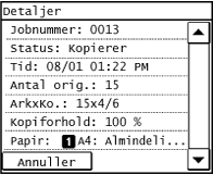 Viser den aktuelle status for det valgte element. Skærmen <Status for kopijob> er vist herunder som et eksempel.