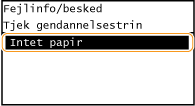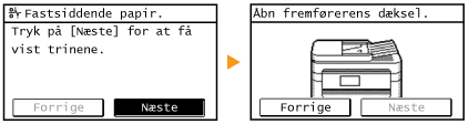 Når der opstår en fejl, vil der i visse tilfælde blive vist instruktionerne i, hvordan der skal reageres på fejlen. Følg anvisningerne på skærmen for at løse problemet. Den skærm, der vises, når der opstår et papirstop, er vist som eksempel herunder (
