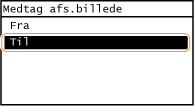 Når du markerer <Til> eller <Kun når der opstår fejl>, kan en del af en sendt fax medtages i rapporten. Tryk på <Medtag afs.billede> til <Til>.