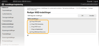Marker afkrydsningsfeltet for at hente oplysninger om maskinen fra en computer via WSD. Afkrydsningsfeltet markeres automatisk, når afkrydsningsfeltet [Brug WSD-print] er markeret. [Brug WSD-scan]