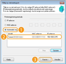Klik på [Automatisk registrering], og vælg maskinen, når den er blevet registreret, og klik på [Næste].