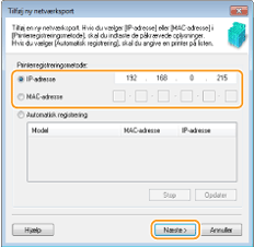 ![]() ![]() Hvis maskinen ikke registreres Klik på [Refresh]. Hvis problemet fortsætter, skal du klikke på [IP-adresse] eller [MAC-adresse], indtaste maskinens IP-adresse eller MAC-adresse (Visning af netværksindstillinger) og derefter klikke på [Næste].