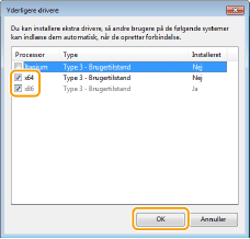 Du kan muligvis ikke installere drivere via netværket afhængigt af operativsystemet og bitarkitekturen (32-bit eller 64-bit) af printserverne og klientcomputerne.