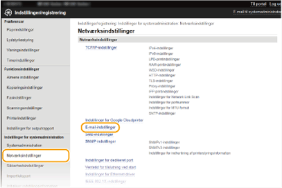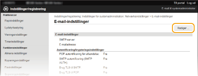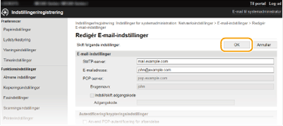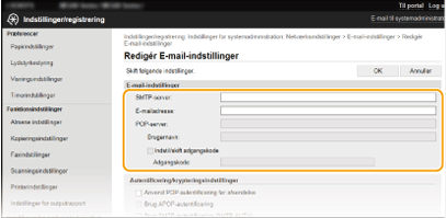 Brug Brugerinterface til fjernbetjening til at konfigurere de detaljerede afsendelsesindstillinger, f.eks. indstillingerne for POP-godkendelse og kryptering af kommunikation, før du sender e-mail. Kontakt din udbyder elle netværksadministrator for at få de nødvendige indstillinger.