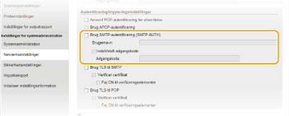 Hvis du konfigurerer SMTP-godkendelse (SMTP AUTH), bliver brugeridentifikation efter brugernavn og adgangskode udført på tidspunktet for afsendelse af e-mail.