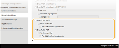Marker afkrydsningsfeltet for at anvende TLS til kryptering af kommunikation med SMTP-serveren. Marker afkrydsningsfeltet for [Verificer certifikat] eller [Føj CN til verificeringselementer] afhængigt af dine behov.