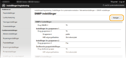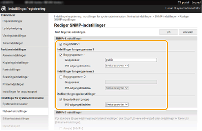 Hvis begge SNMP-versioner er aktiveret, anbefales det, at MIB-adgangstilladelse i SNMPv1 angives til [Skrivebeskyttet]. MIB-adgangstilladelsen kan indstilles uafhængigt i SNMPv1 og SNMPv3 (og for hver bruger i SNMPv3). Hvis [Læs/skriv] (fuld adgangstilladelse) vælges i SNMPv1, negerer det de robuste sikkerhedsfunktioner, der er et kendetegn ved SNMPv3, fordi de fleste af maskinindstillingerne så kan kontrolleres med SNMPv1.