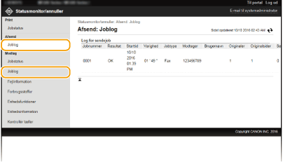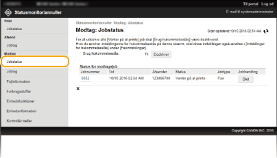 Klik på [Jobnummer], mens et faxjob venter på at blive udskrevet, for at få vist faxdetaljerne. Du kan kontrollere afsenderen, antal udskrifter, eventuelle modtagne billeder og andre oplysninger. Visning af dokumenter fra Brugerinterface til fjernbetjening