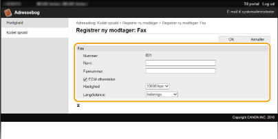 Faxindstillinger) på kontrolpanelet. De indstillinger, der er oprettet fra <Adressebog>, aktiveres for de detaljerede indstillinger for de destinationer, der er registreret i adressebogen.