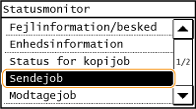 ![]() <Log for sendejob>Viser en liste over de dokumenter, der er blevet sendt. <OK> vises, når et dokument er blevet sendt, og <Fejl> vises, når et dokument ikke kunne sendes, fordi det blev annulleret, eller der opstod en fejl.