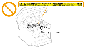 Det innvendige i maskinen og utskriftsluken er svært varm under og rett etter bruk. Unngå kontakt med disse områdene for å hindre brannskader. Utskrevet papir kan også være varmt umiddelbart etter utskrift, så vær forsiktig når du tar i det. Hvis du ikke er forsiktig, kan du få brannskader.