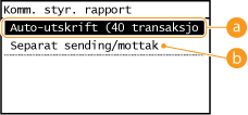 Du kan kontrollere faks- og e-postloggene over sendte og mottatte dokumenter ved å skrive ut en kommunikasjonsstyringsrapport. Rapporten kan skrives ut automatisk etter hver 40. sending, eller du kan skrive den ut manuelt.