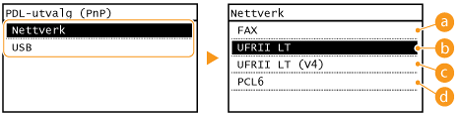 Velg et sidebeskrivelsesspråk, slik at maskinen registreres som en skriver som er kompatibel med dette språket, når den kobles til en datamaskin ved hjelp av Plug and Play. For mer informasjon, se "MF Driver Installation Guide (Installasjonsguide for MF-driver)".