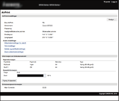 Du kan vise skjermbildet for AirPrint, hvor du ikke bare har tilgang til AirPrint-innstillingene, men også kan se informasjon om forbruksvarer, som papir og tonerkassett. Du kan også konfigurere sikkerhetsfunksjonsinnstillinger (