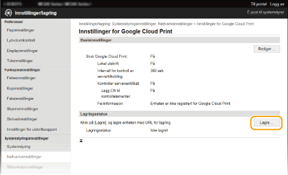 Du må aktivere Google Cloud Print. Klikk på [Rediger], merk av for [Bruk Google Cloud Print], og klikk på [OK].