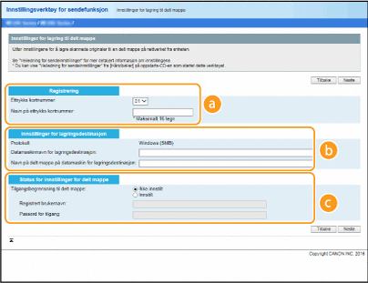 Konfigurere SMB (MF249dw / MF247dw)). Hvis du vil konfigurere maskinen for å lagre skannede dokumenter i en delt mappe på nettverket via SMB, angir du på forhånd plasseringen for den delte mappen fra en datamaskin. Denne delen beskriver hvordan du spesifiserer lagringsplasseringen ved å bruke Verktøy for sending av funksjonsinnstillinger.