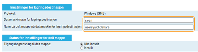 Klikk alternativknappen [Ikke innstilt] eller [Innstilt], i henhold til tilgangsbegrensningene som er angitt for den delte mappen. Når [Innstilt] er valgt, må du skrive inn brukernavnet i tekstboksen [Registrert brukernavn] og passordet i tekstboksen [Passord for tilgang].