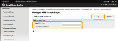 Server Message Block (SMB) er en protokoll for deling av ressurser, for eksempel filer og skrivere, med flere enheter på et nettverk. Maskinen bruker SMB til å lagre skannede dokumenter i en delt mappe. Alt etter hvilket nettverk du bruker, må du kanskje angi NetBIOS-navnet og navnet på arbeidsgruppen.