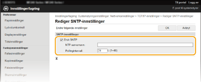 Med Simple Network Time Protocol (SNTP) kan du justere systemklokken ved å bruke tidsserveren på nettverket. Protokollen brukes vanligvis for synkronisering av maskinen og serveren. Tiden justeres basert på Coordinated Universal Time (UTC), så du må angi tidssonen før du konfigurerer SNTP (Dato-/tidsinnstillinger). SNTP-innstillinger kan angis via Fjernkontroll.