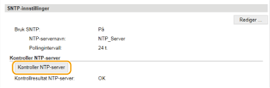 Teste kommunikasjon med NTP-/SNTP-serverenDu kan vise kommunikasjonsstatus med den registrerte serveren ved å klikke på [Innstillinger/lagring]
