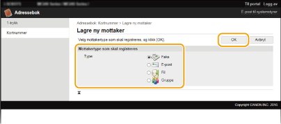 Velg [Mottakertype som skal registreres], og klikk på [OK].