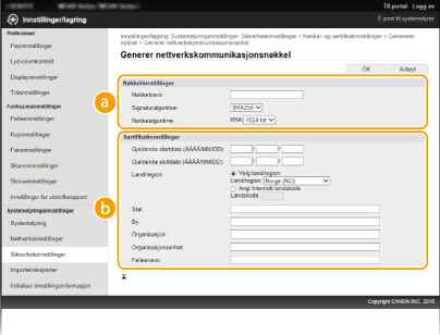 Et nøkkelpar kan genereres med maskinen når det er nødvendig for kryptert kommunikasjon via TLS (Transport Layer Security). Du kan bruke TLS når du har tilgang til maskinen via Fjernkontroll. Opptil fem nøkkelpar (inkludert de forhåndsinstallerte parene) kan genereres på maskinen. Selvsignerte sertifikater brukes med nøkkelpar som er generert i "Nettverkskommunikasjon". Med en "Nøkkel og forespørsel om signering av sertifikat (CSR)", kan du søke om et CA-utstedt digitalt sertifikat for nøkkelparet som ble generert av maskinen.
