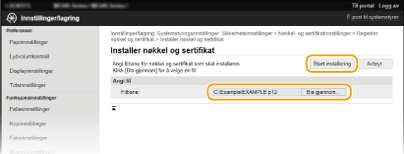 Klikk [Nøkkel- og sertifikatinnstillinger] for å installere et nøkkelpar eller [CA-sertifikatinnstillinger] for et CA-sertifikat.