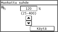 -painikkeilla tai numeropainikkeilla ja napauta kohtaa <Käytä>. Voit asettaa kopiointisuhteen 1 %:n tarkkuudella väliltä 25–400 %.