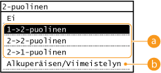 <2-puolinen>-toiminto ei ehkä ole käytettävissä tiettyjen paperikokojen ja -tyyppien kanssa.