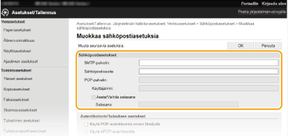 Käytetystä verkosta riippuen SMTP- tai POP3-porttiasetus täytyy ehkä muuttaa ( Porttinumeroiden muuttaminen). Lisätietoja saat Internet-palveluntarjoajaltasi tai verkon pääkäyttäjältä.