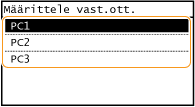 Skannaaminen laitteesta helpomminJos käytät säännöllisesti tiettyjä asetuksia, kuten skannaaminen värillisenä tai mustavalkoisena tai tietty tietokone, jonne skannatut asiakirjat tallennetaan, näiden asetusten määrittäminen joka skannauskerralla voi olla rasittavaa. Rekisteröi nämä asetukset <Scan -> PC> -painikkeeseen, niin voit skannata yhden painikkeen painalluksella. <Scan -> PC> -painikkeita on kaksi: <Scan -> PC1> ja <Scan -> PC2>. Voit tallentaa asetuksesi kumpaan tahansa näistä painikkeista. Skannaaminen <Scan -> PC> -painikkeella