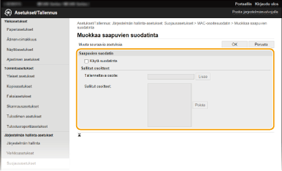 Voit ottaa MAC-osoitteen suodatusasetukset käyttöön tai poistaa ne käytöstä <Valikko>-kohdassa <Koti>-näytössä. MAC-osoitesuodatin