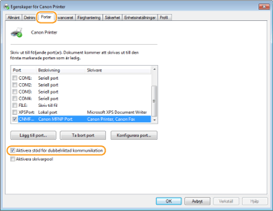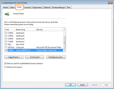 Om du använder en nätverksanslutning och har ändrat enhetens IP-adressOm [Canon MFNP-port] visas som vald port i [Beskrivning] och datorn och enheten tillhör samma delnät kvarstår anslutningen. Du behöver inte lägga till en ny port. Om [Standard-TCP/IP-port] visas måste du lägga till en ny port. Konfigurera skrivarportar