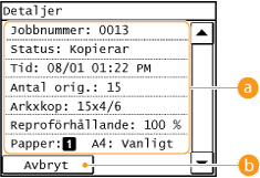 Antal kopior, inställningar och andra detaljer visas. Om du bara vill kontrollera detaljerna utan att avbryta kopieringen, trycker du på