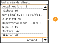 Välj det alternativ du vill ställa in och ändra standardvärdet.