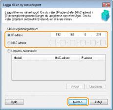 ![]() ![]() Om enheten inte identifieras Klicka på [Refresh]. Om problemet kvarstår klickar du på [IP-adress] eller [MAC-adress], anger enhetens IP- eller MAC-adress (Visa nätverksinställningar) och klickar sedan på [Nästa].